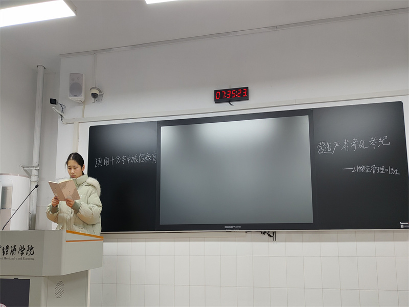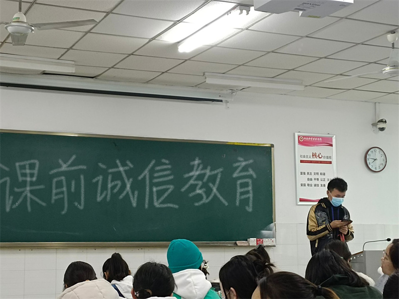 诚信是同学们必备的基本素养。21电子商务01班团支书通过讲述“诚信是中华民族的传统美德,是每个人必须遵守的基本素养”,让同学们明白身为当代老员工不但要具备积极进取的人生态度,更应该拥有诚信做人的根本,以此来告诫大家文明备考、诚信考试。