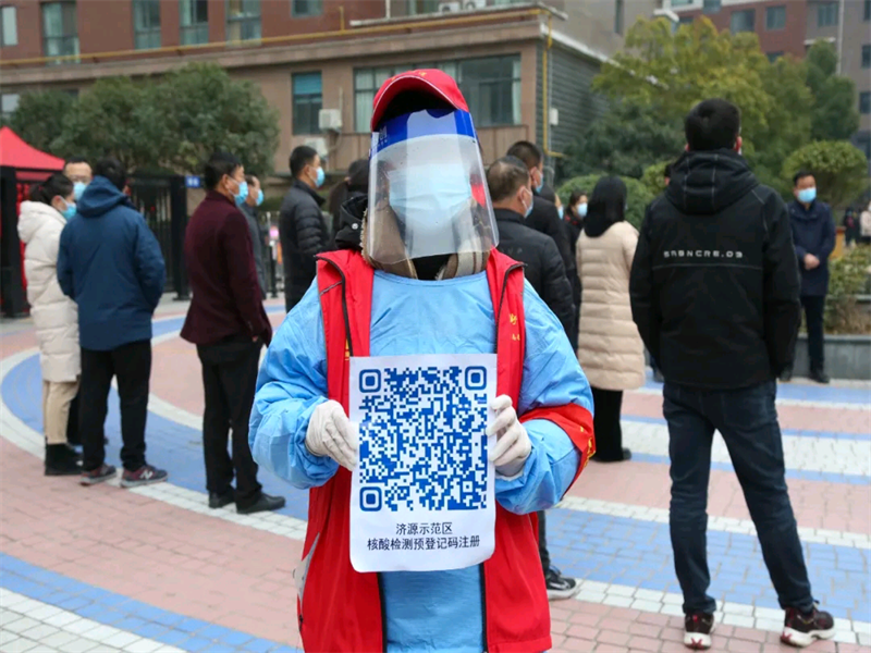 在家乡疫情暴发后,21物流管理01班的李冉同学也毫不犹豫地参与到了家乡济水苑社区的防疫志愿活动中,在志愿服务过程中她主要负责在演练现场入口、等候区、采样区等多个区域,协助受检人员在工作人员的引导下检测体温、扫码登记等。李冉同学表示,面对疫情我们每个人都应贡献自己的力量,团结一心共抗时艰。